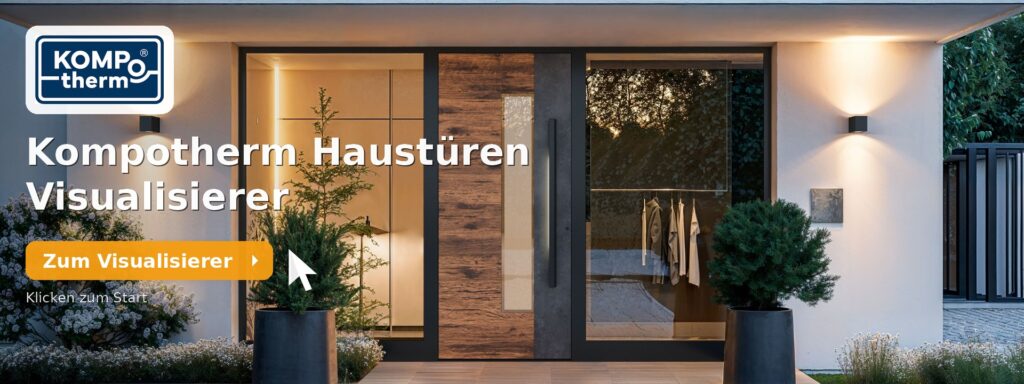 Wenn Sie bereits eine Richtung im Kopf haben, können Sie direkt online starten: Über unseren Kompotherm Haustüren Visualisierer ist es möglich ein Foto Ihres Hauseingangs mit vielen Kompotherm-Modellen zu versehen.